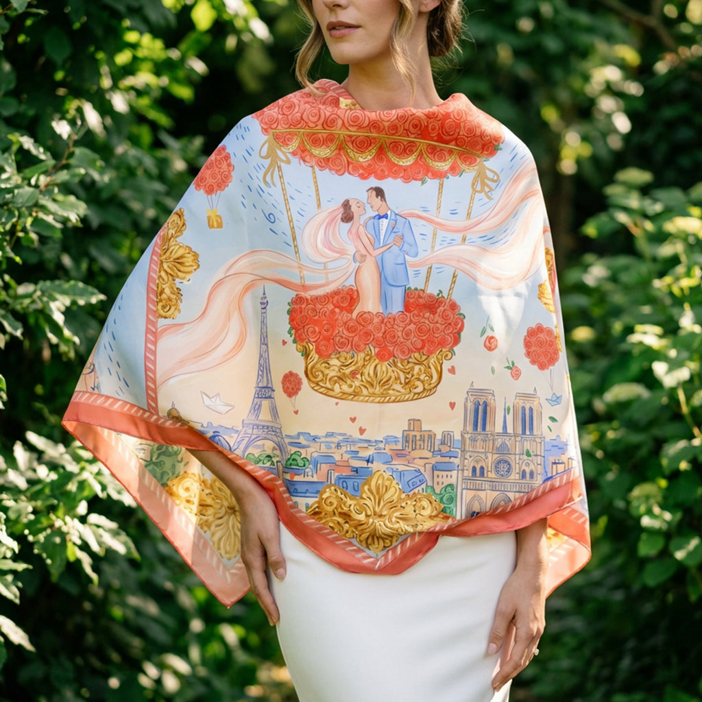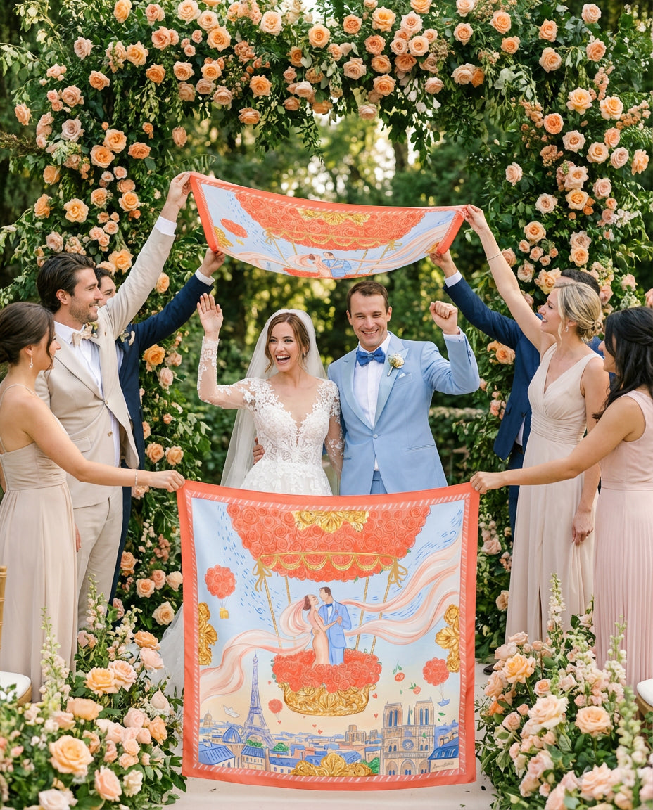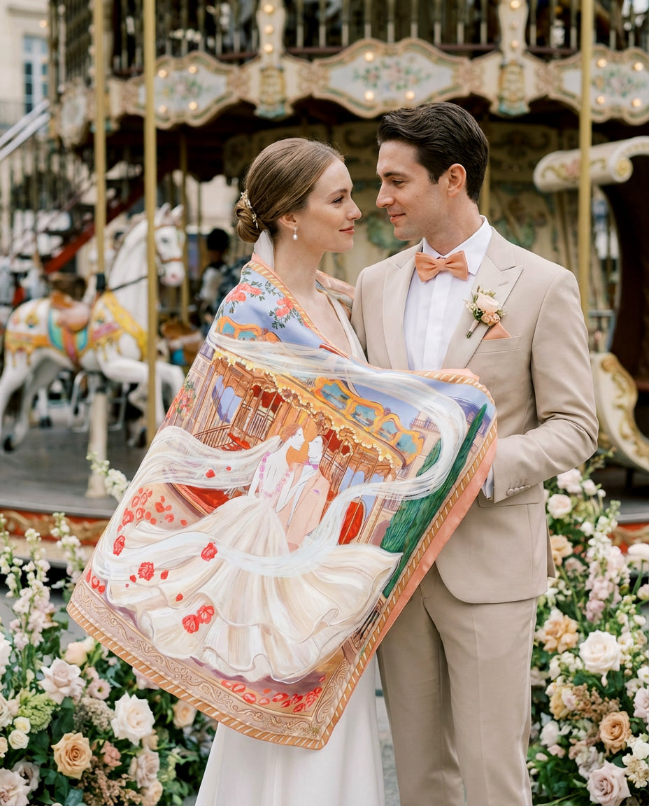 Since she was a little girl, Helen dreamed of riding a magical carousel horse in Paris. On their wedding day, Peter brought her dream to life, whisking her away to the heart of Paris to marry. Their bespoke silk scarf now captures that enchanting moment—her childhood fantasy transformed into a timeless work of art.
