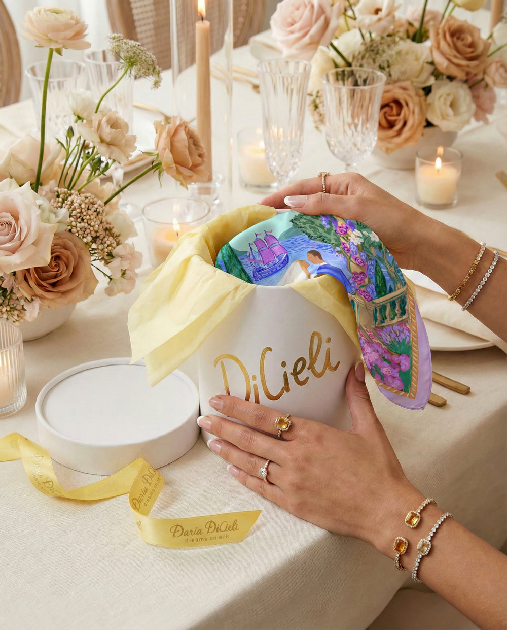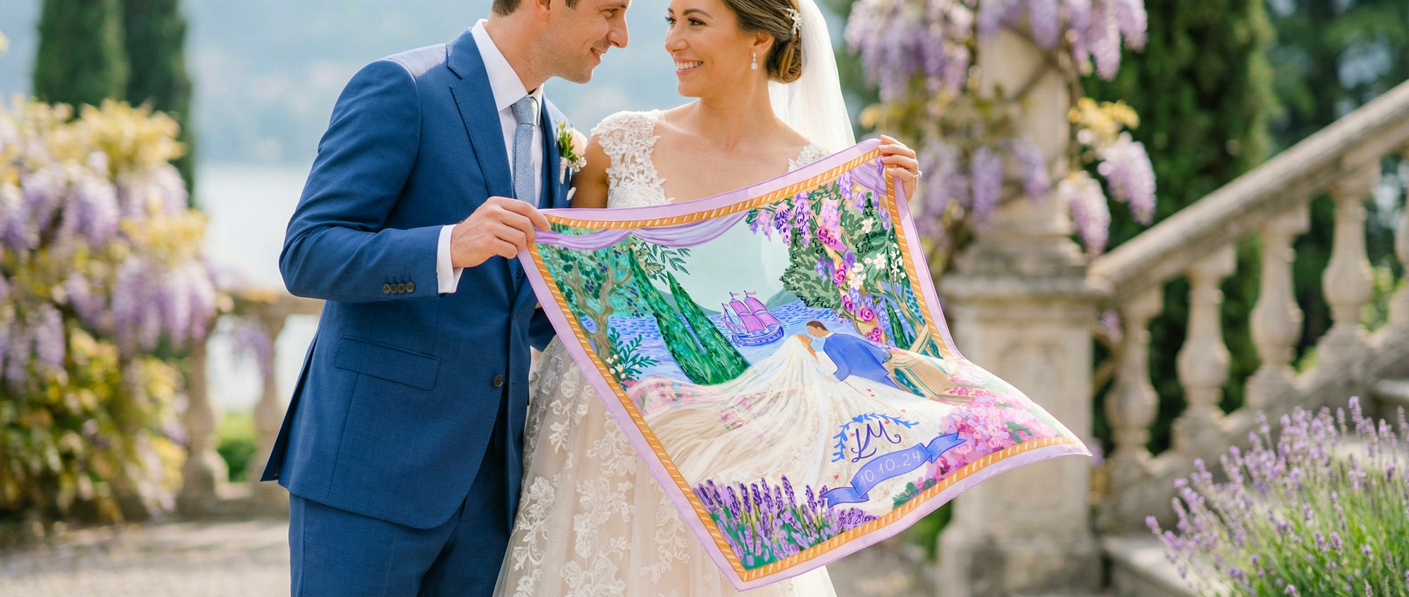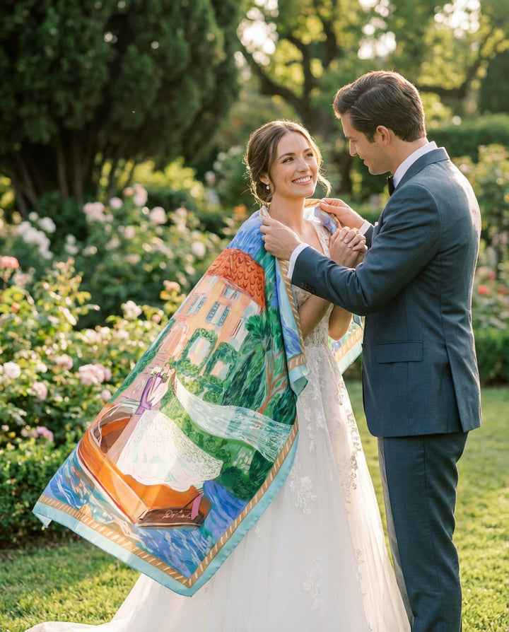 Our custom silk scarves are designed exclusively for each couple and gifted to their guests as a lasting reminder of a once-in-a-lifetime celebration.